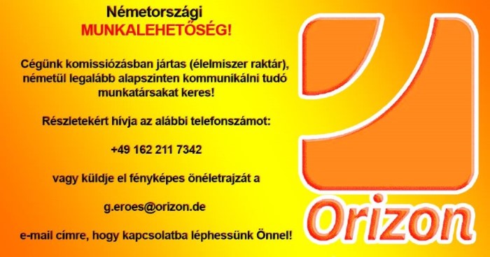 Pályázni német, angol vagy magyar nyelvű önéletrajzzal lehet, melyet a g.eroes@orizon.de email címre várunk!