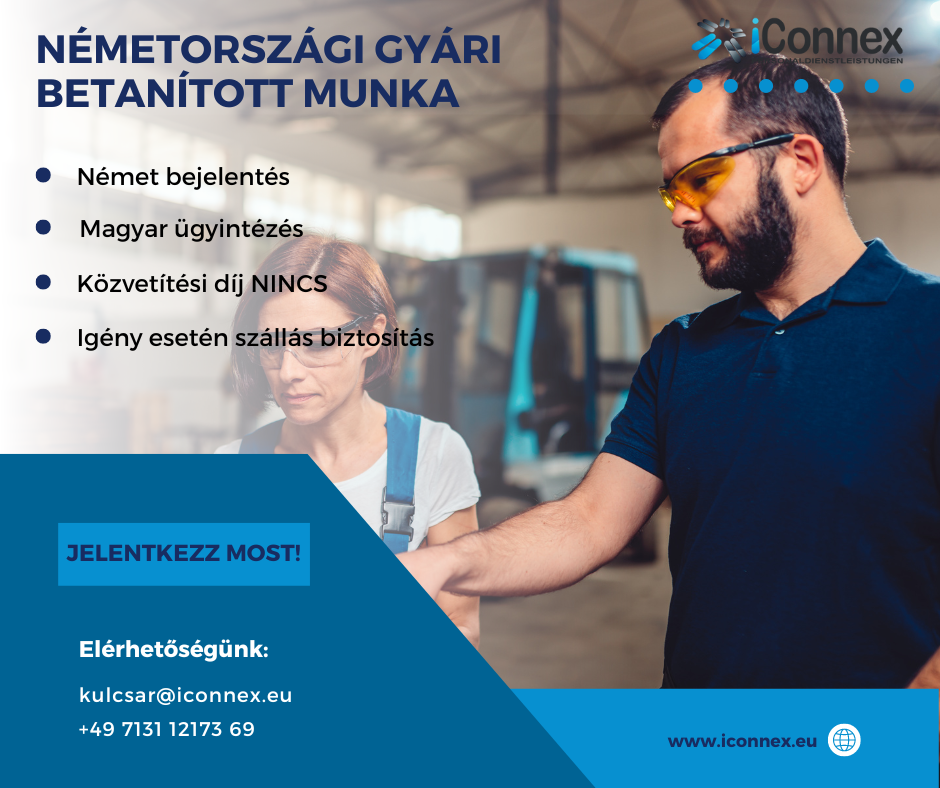 Az iConnex GmbH egy évek óta dinamikusan növekvő német cég, amely már több száz elégedett munkavállalóval rendelkezik. A vállalat Németország Baden-Württembergi tartományában van jelen és sokéves tapasztalattal rendelkezik a kelet Európai térségből érkezett munkavállalók foglalkoztatásában. Cégünket kimagaslóan jó minőség és megbízhatóság jellemzi, munkavállalóinkra kiemelt figyelmet fordítunk.