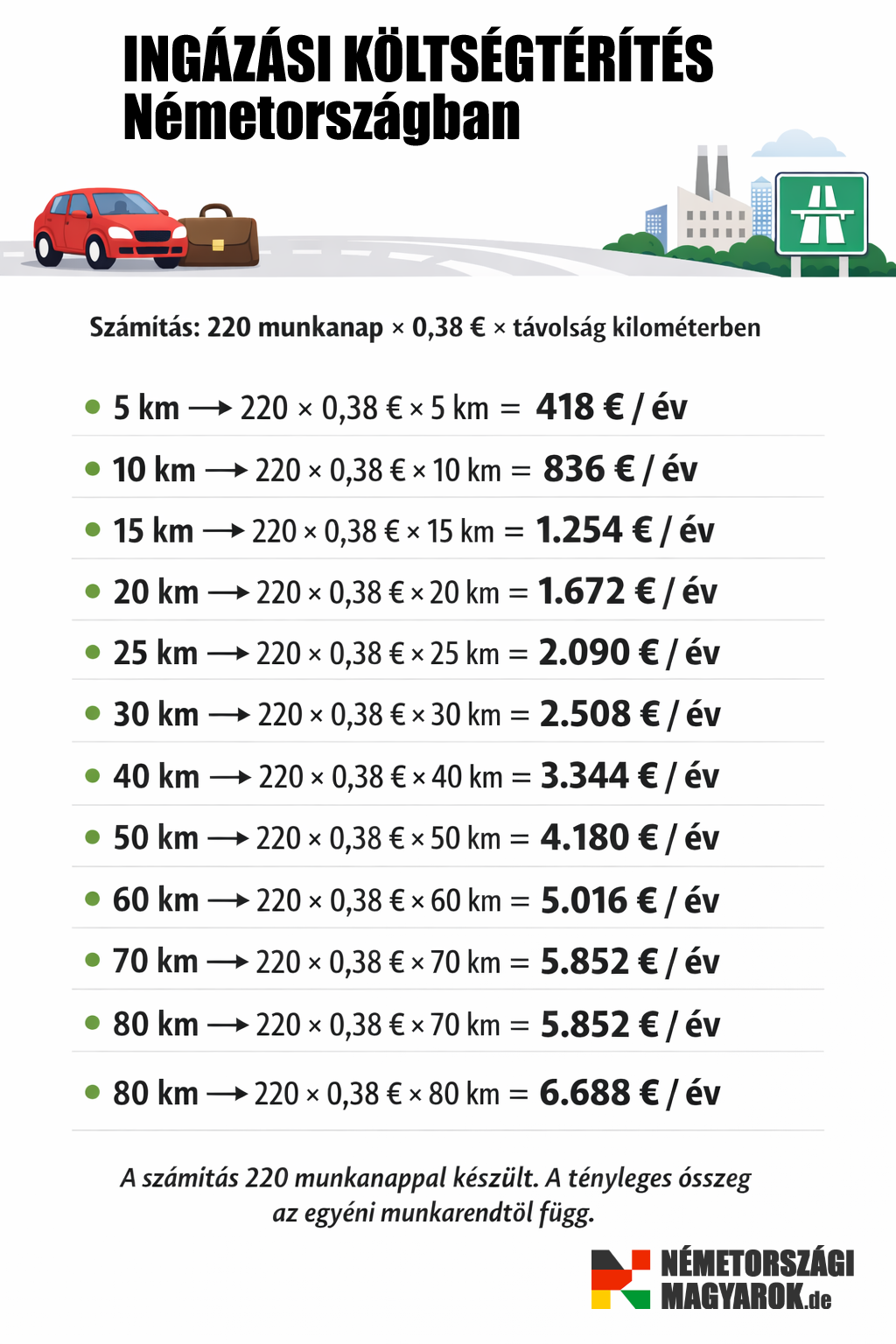 - 25 km → 220 × 0,38 € × 25 km = 2.090,00 € / év