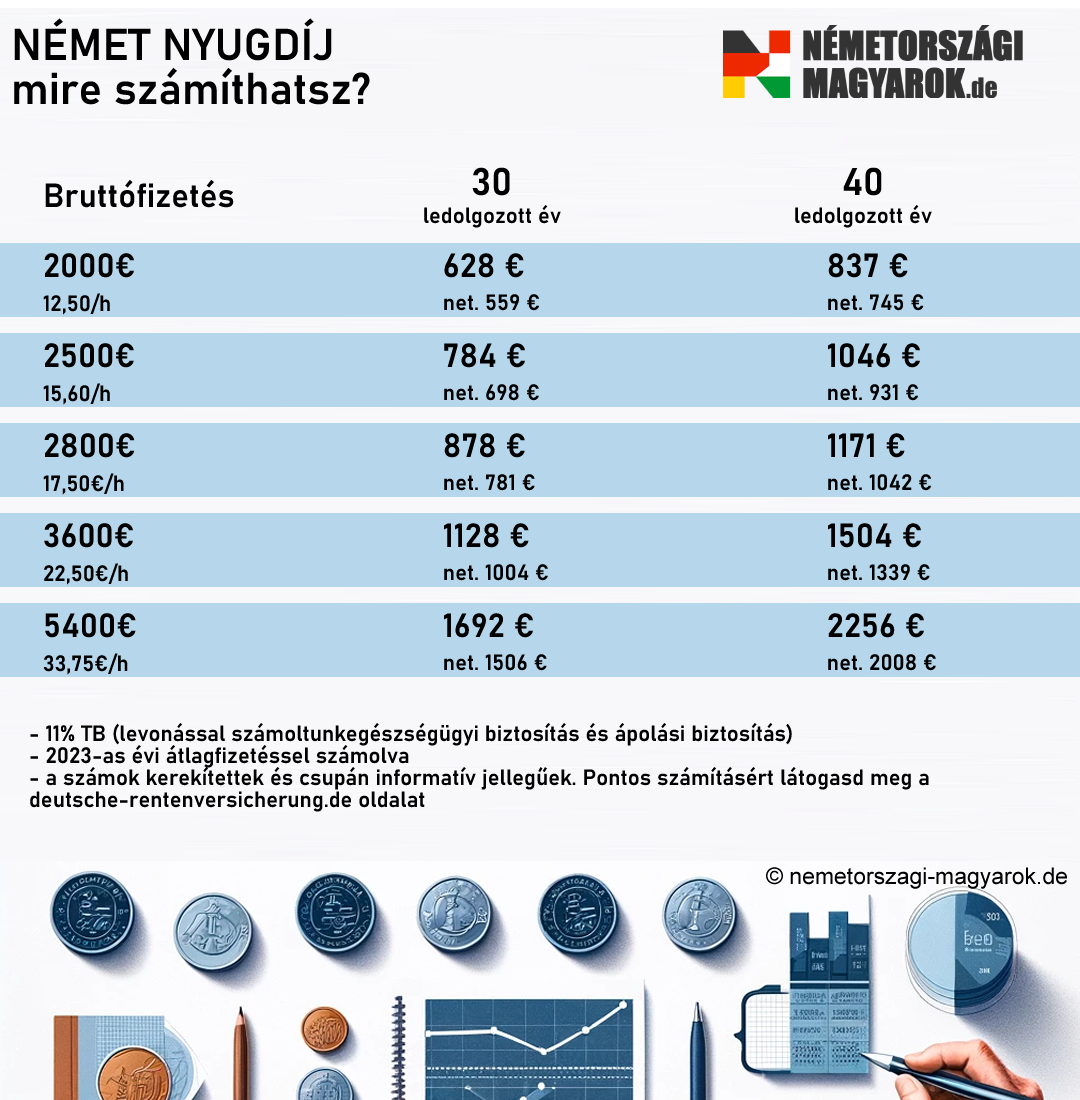 Erről a témáról már több cikket is írtunk. Ez a cikk magyarul mutat meg szinte minden részletet. Van benne táblázat, kalkulátor és számítási képlet is: Német nyugdíj kalkulátor