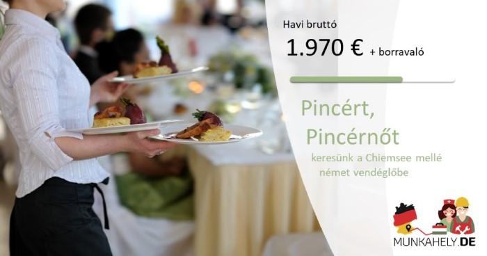 Mi, a Munkahely.DE egy müncheni munkahely és lakásközvetítő cég vagyunk, és közepes szintű nyelvtudással pincért keresünk egy 4 csillagos német étterembe, München és Salzburg között a Chiemsee környékén. Tel.: +498921547388