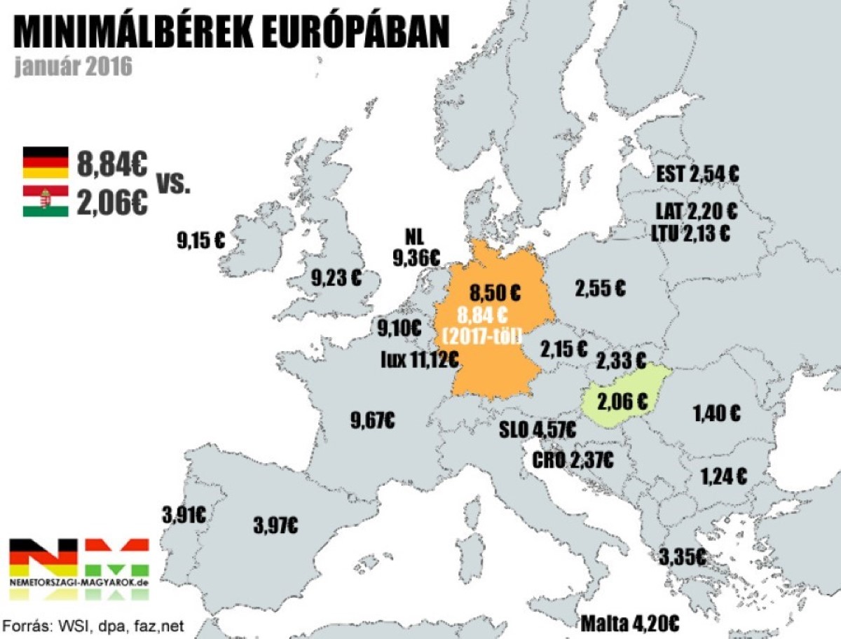 Az adatok szerint Magyarországon 2,06€ míg Németországban (2017-töl) 8,84€ a minimálbér összege.