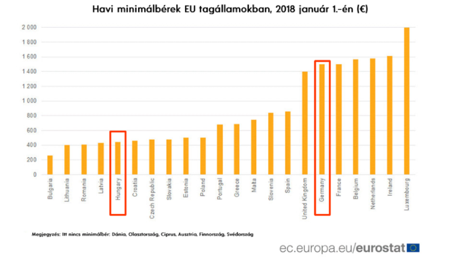 Az adatokból kiemeltük Magyarország (kb 440€/hó) és Németország (1.498€) adatait.