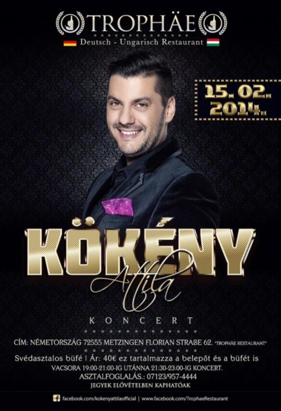 Már harmadik alkalommal rendezük meg a Magyar estet itt a Trophäe-ban a Florian Str. 62. szám alatt Metzingenben 2014.02.15. napján. Elözőekhez képest kicsit izgalmasabbra kicsit különlegesebbre terveztük a mostanit, hiszen Kökény Attila akit megvalsztottak az Év Férfihangjának, jön el hozzánk énkelni, hogy mindenkit elkápráztason a hangjával.