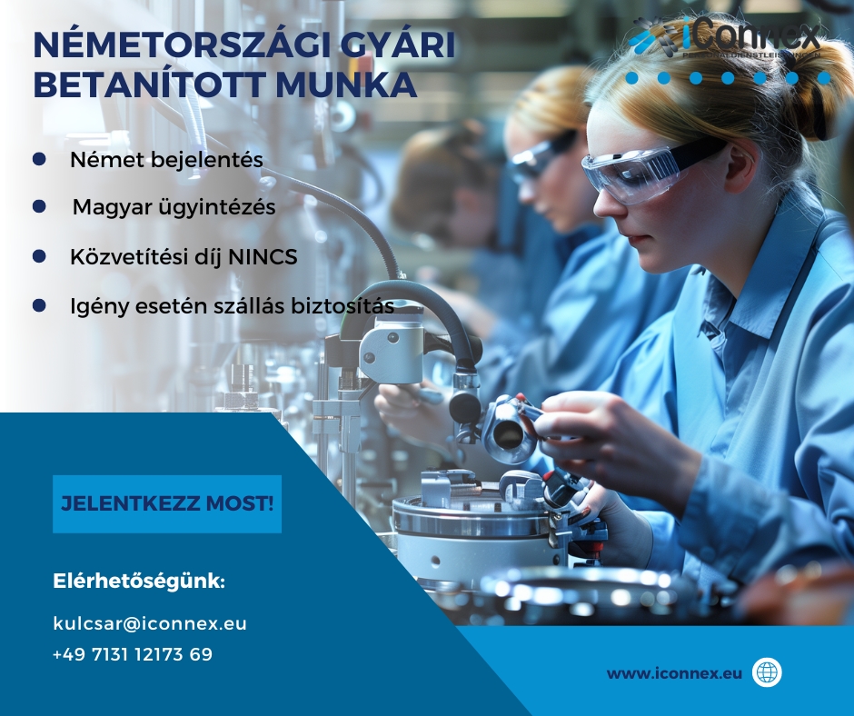 Közepes szintű német nyelvtudással rendelkező kollégákat keresünk elektronikai berendezéseket gyártó céghez. A feladatok közé tartozik: gépkezelés, minőségellenőrzés, összeszerelés. Hosszú távú munkalehetőség, német bejelentéssel és átvételi lehetőséggel. Hölgyek, férfiak és párok jelentkezését is várjuk! Igény esetén szállás biztosítással.