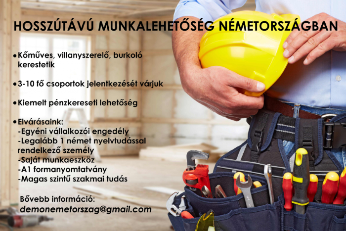 Építőipari munka (kőműves, villanyszerelő, burkoló) Németországban - nettó 3000 euro/hó