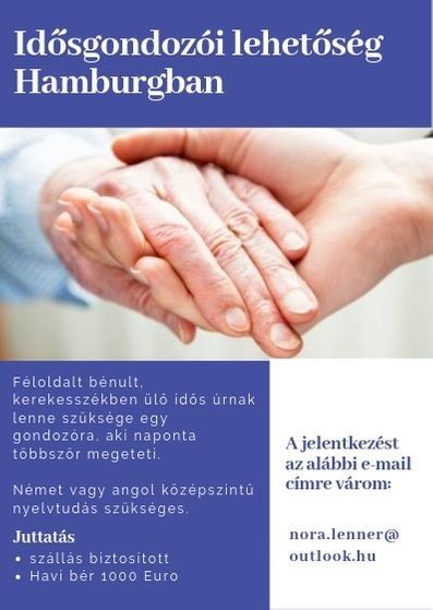 Hamburgban élő idős úrnak lenne szüksége gondozásra, féloldalt bénult, kerekesszékben ül, ezért nehézséget okoz számára az evés, ebben kellene főleg segíteni. Esetenként előfordul, hogy tisztába kell tenni. A felesége napközben dolgozik, de esténként általában ő is otthon tartózkodik és segít az ellátásában.