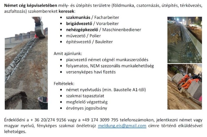 Német cég képviseletében mély- és útépítés területre (földmunka, csatornázás, útépítés, térkövezés, aszfaltozás) szakembereket keresek!