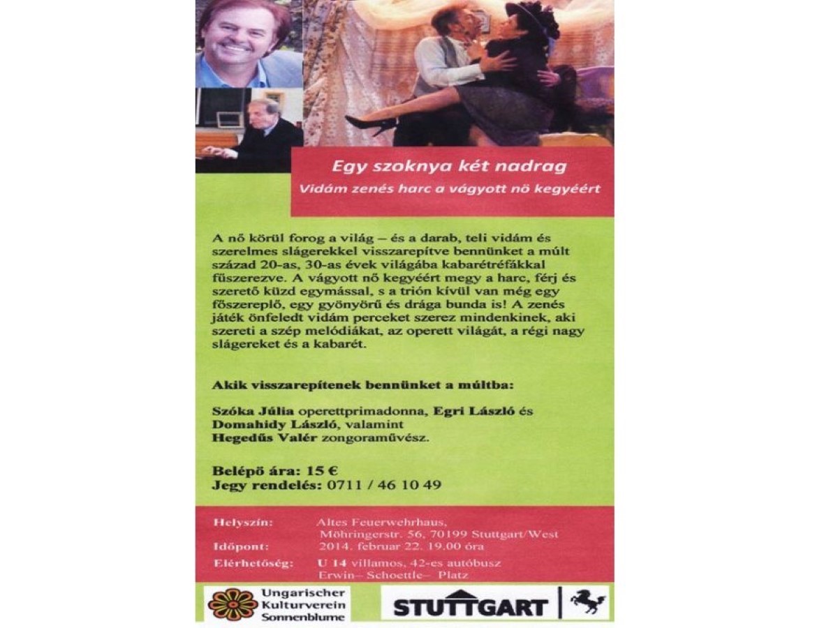 Ildiko Riester küldte be 23 January 2014 időpontban Dates 2014. február 22., szombat – 19:00 Város Stuttgart Kép Programtípus Koncert A hozzászóláshoz regisztráció és bejelentkezés szükséges